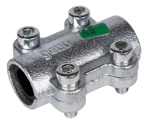Para sellar agujeros y grietas en tubos de polietileno en instalaciones de agua, y reparaciones de corto plazo en instalaciones de aire comprimido. • Cuerpo de hierro fundido maleable con terminación