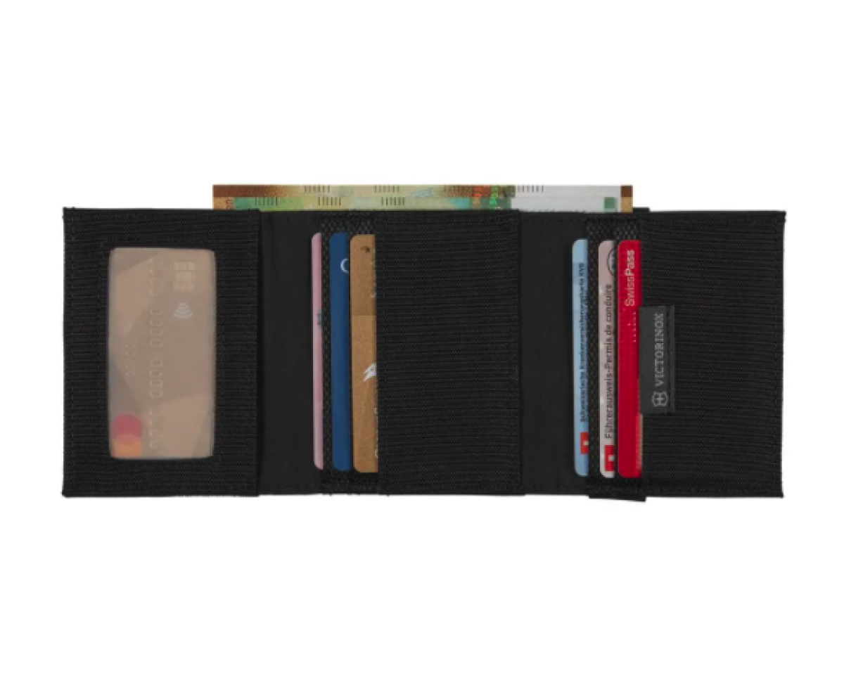 BILLETERA TRES DOBLECES 5.0 9X10CM VICTORINOX Dinero y tarjetas de crédito seguros Ranura de micromalla para identificación Banda elástica que mantiene la cartera cerrada N° de artículo610394 Tamaño3 x 9 x 10 cm Peso0.1 kg La tri-fold Wallet es una cartera de viaje de lujo para viajeros experimentados. Al abrirla, encontrará ranuras exclusivas para tarjetas y un bolsillo grande para el dinero. Dóblela para mantener su dinero y tarjetas de crédito seguros. Colóquela en su bolsillo, y estará listo para partir.