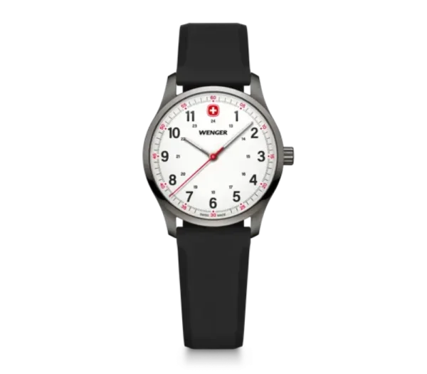 CITY SPORT 34, BKI, WHE DIAL, BLK SILICONE STR Conozca el reloj inteligente y sencillo con credenciales impresionantes para un estilo de vida activo. El City Sport, fabricado en Suiza, garantiza que siempre esté en el lugar correcto en el momento correcto y con el mejor estilo posible. La delgada caja del reloj contiene una esfera mate minimalista con números modernos en una fuente elegante. Con una escala de tiempo militar y detalles en rojo, tiene un aspecto deportivo definitivo. Gracias a las manecillas revestidas con Super-LumiNova® que garantizan una buena legibilidad incluso de noche, es un dinamo que funciona las 24 horas del día, los 7 días de la semana, y que sigue el ritmo cuando la vida avanza rápido.