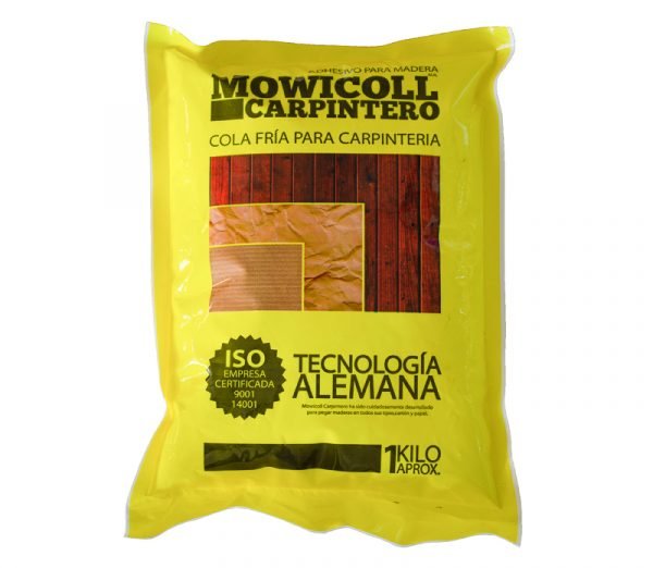 COLA FRIA CARPINTERA BOLSA 1 KILO MOWICOLLDestaca por su elasticidad y alta cohesión interna lo que lleva a encolados de alta resistencia perdurables en el tiempo. Es especialmente adecuado para las operaciones de encolado en la industria del mueble, además de su uso universal para el pegado de substratos porosos como papel, cartón y maderas. Para usar en trabajos de artesanía, manualidades y de bricolaje en general. Dentro de los usos principales: uniones de tableros y ensambles en general de maderas duras o blandas, enchapados de láminas de madera a tableros de maderas aglomeradas, encolado manual o mecánico de tarugos para muebles, reparaciones de amoblados, ventanas, etc.