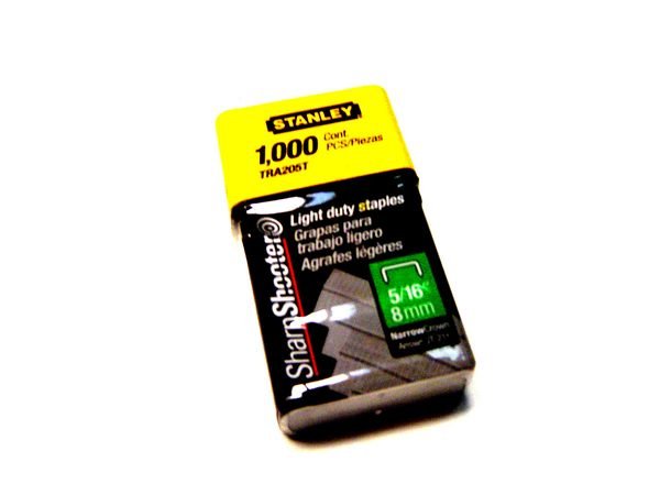 CORCHETES STANLEY 1/4 N204Para Trabajo Ligero. Corona Estrecha. Ideal Para Ser Usados En La Corchetera Stanley® Light Duty Staple Gun (Tr45).Usos: Revestimiento De Repisas, Mallas Para Ventanas, Forros De Repisas, Mostradores.CARACTERÍSTICAS: – Grapas ligeras de 0.2 in para trabajos ligeros en el hogar y trabajos de grapado de manualidades. – Corona estrecha para trabajo ligero, compatible con TR45 y Arrow JT-21. – Para uso en grapadoras Stanley TR45 y Arrow JT-21 – El paquete incluye 1000 grapas