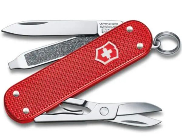Herramientas Hoja pequeña Tijeras Lima de uñas Destornillador 2.5 mm Anilla Dimensiones Altura6 mm Longitud58 mm Ancho18 mm Peso17 g Detalles MaterialAlox BloqueableNo Hoja para una manoNo N.° de características5 ColorRojo