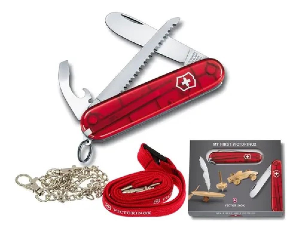 Navaja de bolsillo mediana para niños. Los niños ven a los adultos con un sentido de curiosidad y admiración. Y no es de extrañarse: Los adultos tenemos Navajas Suizas. Cuando llegue el momento para algún joven importante en su vida de dar un paso hacia adelante y de crecer, regálele una My First Victorinox, la navaja de bolsillo creada específicamente para ellos. A esta navaja la fabricamos con nueve funciones, para que puedan hacer lo que necesitan hacer, y le quitamos la punta de la hoja para mantenerlos seguros.