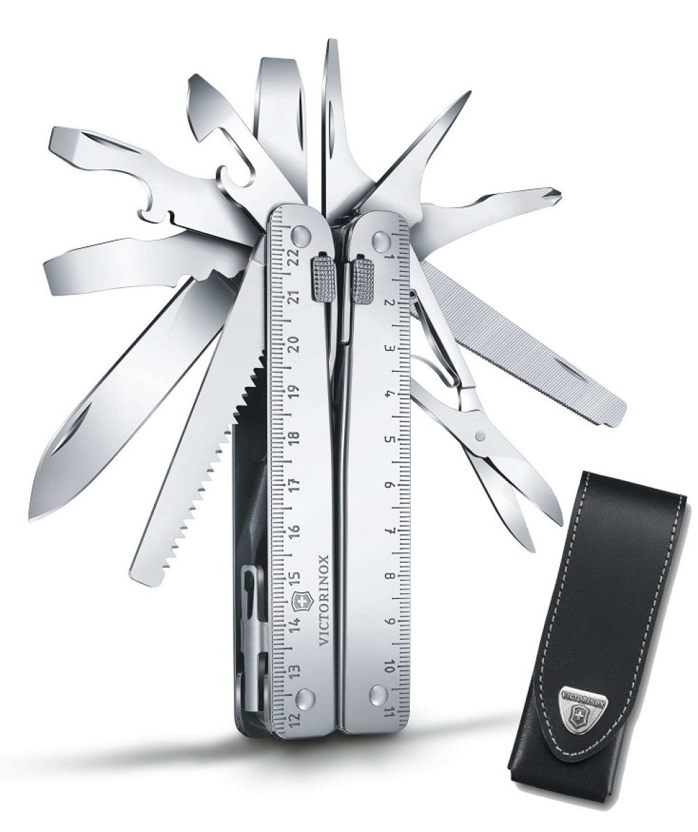 Descripción Descripcion: – 4-1 / 2 pulgadas de largo cuando está cerrado, pesa 10 onzas – Viene con una bolsa de cuero negro original Victorinox – Garantía de por vida 1.alicate mutiusos de punta fina 2.cortacables para cable delgado y suave de hasta 40 HRc 3.cortador para cables endurecidos 4.hoja, grande 5.tijeras 6.serrucho para madera 7.punzón escariador 8.abrelatas 9.destornillador de 3 mm 10.destapador 11.destornillador de 5 mm 12.curvador de cables 13.Destornillador Phillips 1 / 2 14.destornillador de 2 mm 15.destornillador de 7.5 mm 16.abre cajas, resistente 17.cincel de 7 mm 18.pela cables 19.pelacables 20.regla (pulgadas) 21.ojal de fijación 22.regla (cm) 23.serrucho metálico 24.lima metálica