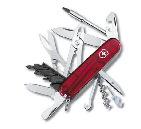 Características clave – Con una llave de tuercas para ajustar pernos en sus dispositivos electrónicos – Navaja de bolsillo hecha en Suiza con 32 funciones – Incluye un estuche de bits plegable y pinzas Dimensiones Altura – 28 mm Longitud – 91 mm Peso – 153 g Navaja de bolsillo mediana con estuche de bits plegable Partimos de la tradicional navaja para oficiales y sus funciones y le añadimos herramientas, como una llave de tuercas, para satisfacer los nuevos estándares de la industria electrónica. Esa leyenda sigue viva en la era digital con la navaja de bolsillo CyberTool. Tiene todo lo que usted necesita para convertirse en un superusuario. Herramientas hoja grande hoja pequeña sacacorchos mini-destornillador punzón escariador abrelatas destornillador 3 mm destapador destornillador 6 mm pela cables porta bit llave dado hexagonal hembra de 5 mm, para conectores D-SUB dado hexagonal hembra de 4 mm para bits anilla palillo de dientes pinzas bolígrafo de presión alfiler, acero inoxidable alicate multiuso corta alambre prensa terminales tijeras gancho multiusos bit acanalado 4 bit Phillips 2 bit Phillips 0 (Pozidrive) bit Phillips 1 (Pozidrive) bit Torx 10 bit Torx 15 bit Hex 4 bit Torx 8 Detalles Material de la cacha – ABS/Cellidor Hoja bloqueable – No Hoja para una mano – No