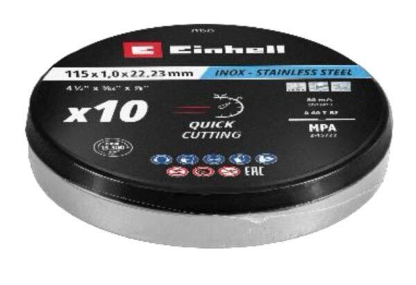 DISCO CORTE 4 1/2′ 1MM INOX LATA 10 UN EINHELLDale el toque profesional a tus proyectos con este pack de 10 discos de corte EINHELL. Diseñados para acero inoxidable, estos discos de te brindan cortes precisos y limpios en metal, ¡sin sacrificar velocidad! Su durabilidad te asegura un rendimiento constante, ideal para trabajos exigentes. ¡No esperes más para obtener resultados impecables!
