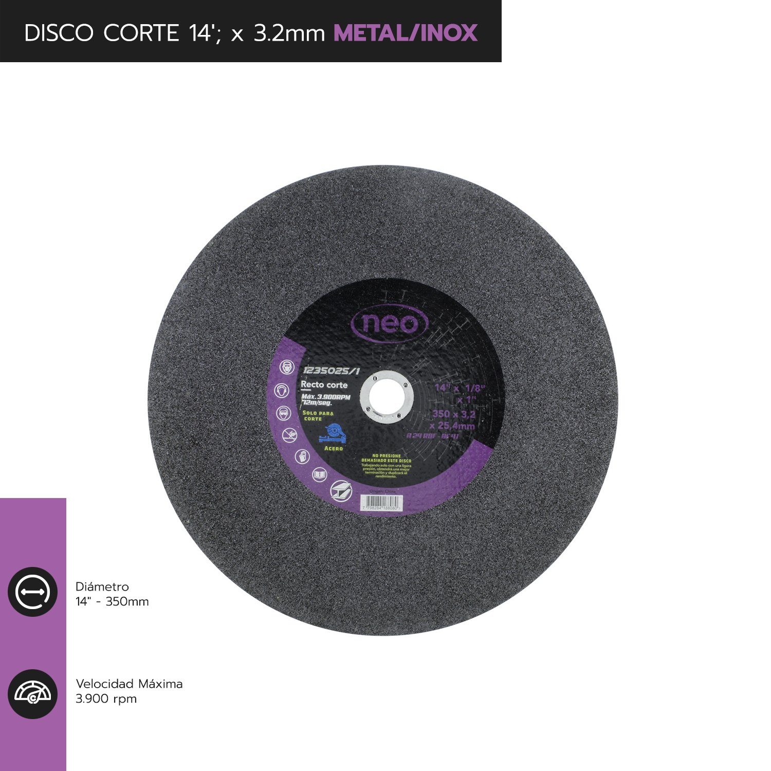 Disco abrasivo de corte especial, 350mm. Para acero y acero inoxidable. Recto de corte para acero en maquinas estacionarias. Realiza cortes rápidos y de mayor precisión Uso: Profesional MODELO DAC 835032 MEDIDA 350 X 3,2 X 25,4 MM VELOCIDAD MAXIMA 5100 RPM