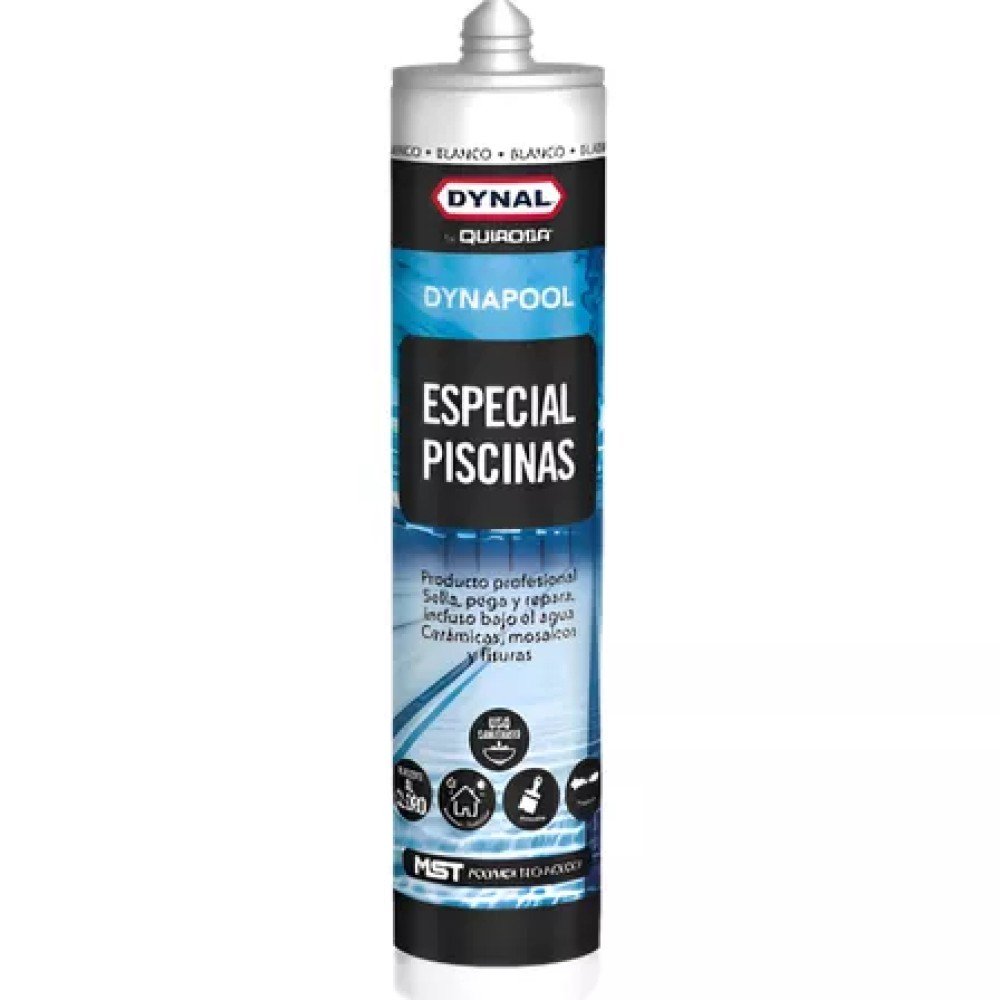DYNAPOOL ESPECIAL PISCINAS POMO 290ML Producto profesional Sella, Pega y Repara incluso bajo el agua cerámicas, mosaicos y fisuras. Pegado y Sellado elástico, elaborado para piscinas. Resistente al agua, agentes químicos como el cloro y sales y a condiciones climáticas extremas. Ofrece una fuerte adhesión en materiales como cerámica, azulejos, hormigón, fibra de vidrio y metal, manteniendo su elasticidad para soportar movimientos estructurales. De curado rápido y fácil aplicación, es ideal para trabajos de sellado y pegado en piscinas. • Se pueden usar en zonas húmedas y bajo el agua. • Mayor estabilidad en envase. Vida útil de18 meses. • Resistentes a los rayos UV. • Aplicables en interior y exterior. • Pintables. • Alta resistencia a la tracción. (fuerza) • Alta flexibilidad. • Libres de disolventes, isocianatos y siliconas. • Mínima emisión de COVs (componentes orgánicos volátiles). • Excelente pegado en la mayoría de los materiales de construcción sin necesidad de imprimación previa.