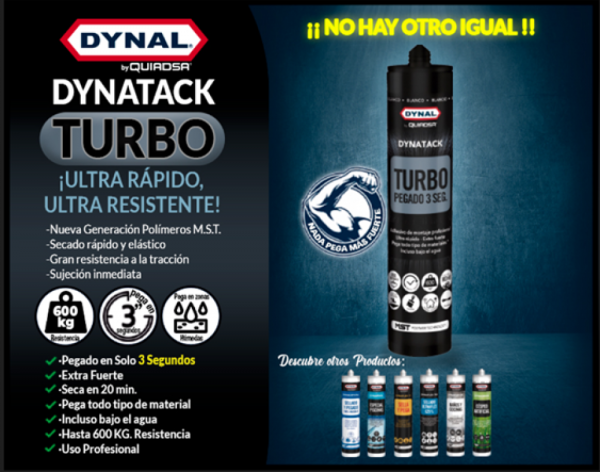 Descripción: Fija + Plus Turbo. Pegado en 3 segundos. Adhesivo de montaje profesional Ultra rápido – Extra fuerte, que pega una gran gama de materiales y/o superficies (porosos y no porosos), incluso bajo el agua con sujeción inmediata en 3 segundos y una tracción de 600 kg. Ofrece una unión elástica y duradera, con tecnología de vanguardia que permite un curado rápido y flexibilidad para soportar movimientos leves.