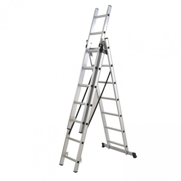 ESCALA EXTENSIBLE 3 TRAMOS PROFESIONAL 4,27 MT Escaleras de Aluminio Ligereza: Son muy livianas y fáciles de transportar, ideales para tareas que requieran moverlas constantemente. Uso general: Perfectas para trabajos domésticos o de construcción ligera. Economía: Son más económicas que las de fibra de vidrio, lo que las convierte en una opción accesible para tareas cotidianas. Limitaciones: Conductoras de electricidad, por lo que no son seguras para trabajos cercanos a cables energizados o equipos eléctricos. Además, son menos resistentes a impactos y pueden deteriorarse en ambientes muy húmedos o corrosivos.