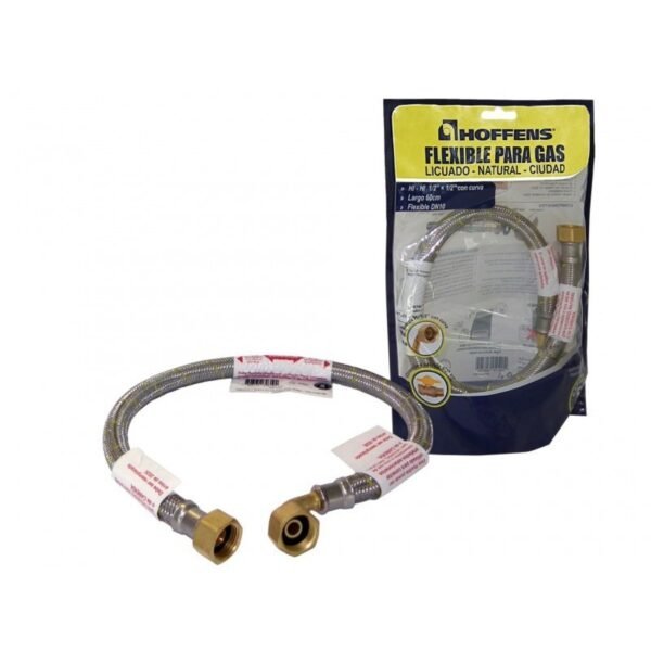 FLEXIBLE GAS 1/2-1/2 HI-HI 60CMS.CON CODO CERTIFICADOConector Flexible trenzado de acero inoxidable con rosca interior 1/2”- rosca interior 1/2” con curva, para uso en conexión de red de gas y artefactos del hogar.