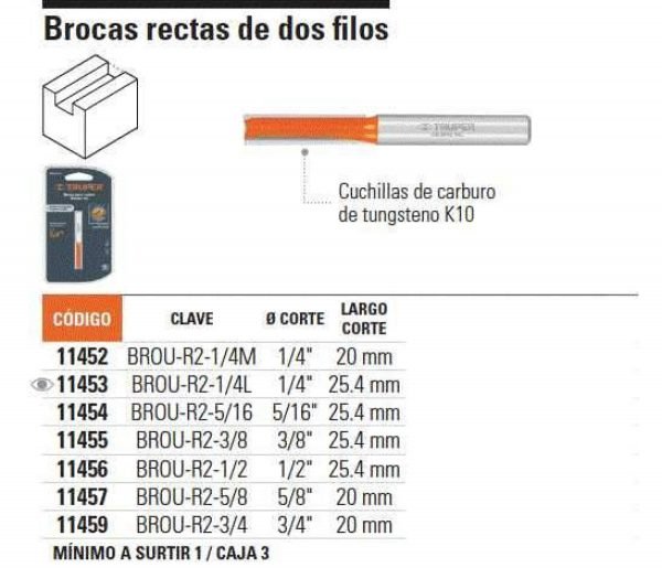 FRESA RECTA 5/16’X1′ 11454 TRUPERBroca para router, recta 2 filos, 5/16′, TruperCuerpo de acero al cromo y cuchilla de carburo de tungsteno • Zanco de 1/4′ • Para aplicaciones de fresado en router • Cortes limpios en madera, MDF, laminados y madera contrachapada Zanco 1/4′ (6.5 mm) Diámetro de corte 5/16′ (8 mm) Largo de corte 1′ (25 mm) Largo total 2 1/4′ (57 mm) Velocidad de corte 30,000 rpm Empaque individual Blíster Inner 3 Master 24