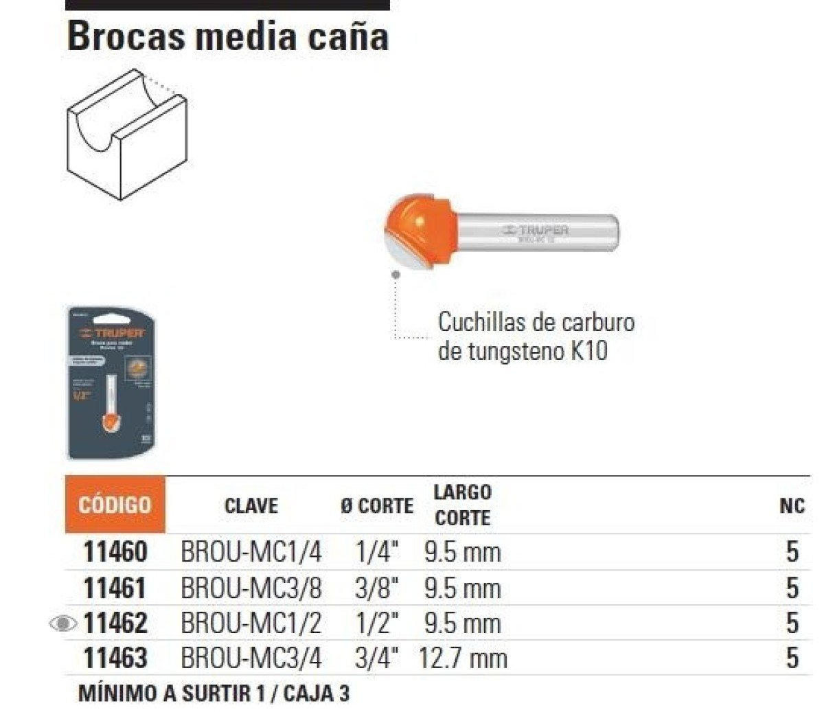 FRESA MEDIA CAÑA 3/8″X3/8″ 11461 TRUPER Cuerpo de acero al cromo y cuchilla de carburo de tungsteno • Zanco de 1/4″ • Para aplicaciones de fresado en router • Cortes limpios en madera, MDF, laminados y madera contrachapada Zanco 1/4″ (6.5 mm) Diámetro de corte 3/8″ (10 mm) Largo de corte 3/8″ (10 mm) *Las imágenes exhibidas son referenciales, y no constituyen necesariamente una representación exacta de la realidad ni definen el producto final* Se recomienda al cliente la lectura manual del usuario y proceder con los cuidados básicos de mantenimiento preventivo. p { margin-bottom: 0.25cm; line-height: 115%; background: transparent } *Las imágenes exhibidas son referenciales, y no constituyen necesariamente una representación exacta de la realidad ni definen el producto final* Se recomienda al cliente la lectura manual del usuario y proceder con los cuidados básicos de mantenimiento preventivo. p { margin-bottom: 0.25cm; line-height: 115%; background: transparent }