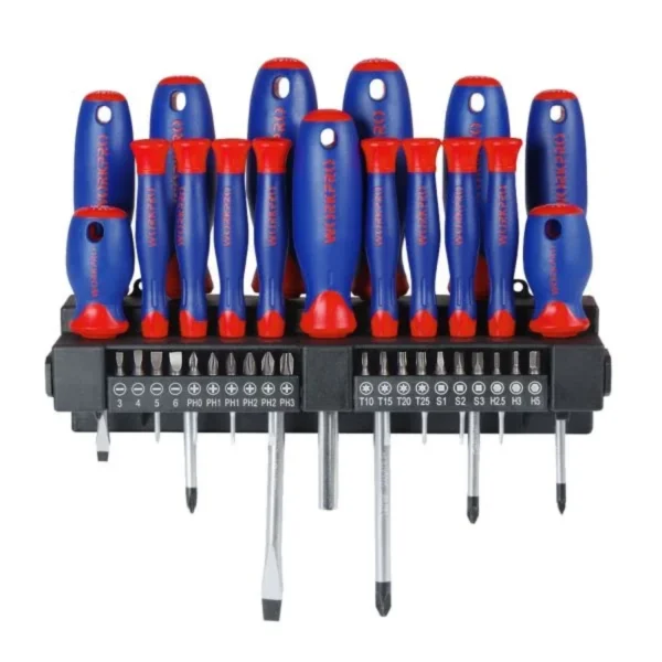 8 Destornilladores, 6X38mm, 5x75mm, 8x150mm, PH2x38mm, PH2X100mm, PH3x150mm, PZ1x100mm, PZ2x100mm 8 Destornilladores de precisión: 2 mm, 2,5 mm, 3 mm, PH00, PH0, T7, T8, T9 1 Soporte magnético para puntas 20 puntas: Plana: 3,4,5,6, PH0, PH1x2, PH2x2, PH3, T10, T15, T20, T25, S1, S2, S3, H2.5, H3, H5