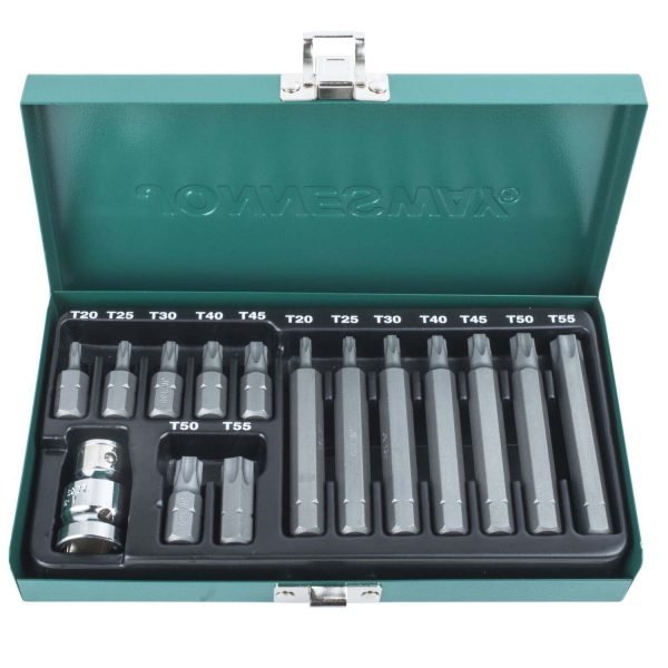 Juego de puntas Torx, 15 Pzas. Calidad profesional. Encastre 1/2′ Incluye adaptador para Chicharras 1/2′ Ficha técnica MODELO S29H4215S CONTIENE 15 Pzas. 7 PUNTAS TORX DE T20, T25, T30, T40, T45, T50 y T55. 7 PUNTAS TORX LARGAS DE T20, T25, T30, T40, T45, T50 y T55 1 ADAPTADOR PARA CHICHARRAS DE 1/2′