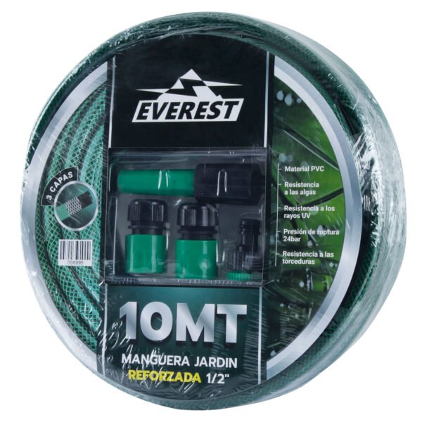 MANGUERA JARDIN REFORZADA 1/2’X 10 MT C/ACCESORIOS MATERIAL PVC3 CAPASRESISTENCIA A LOS RAYOS UVRESISTENCIA A LAS TORCEDURASRESISTENCIA A LAS ALGASPRESIÓN DE RUPTURA 24BAR MODELO KG01-1210F LARGO 10 MT INCLUYE PITON Y CONECTORES MEDIDAS LOGISTICAS (LARGOXALTOXANCHO) 32X32X5 CM PESO 1,5 KG