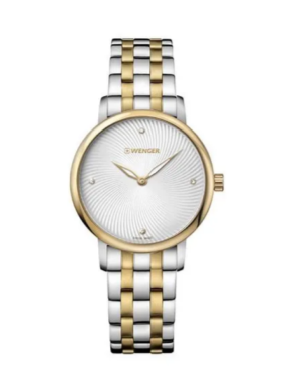 URBAN DONNISSIMA,MUJER,PLATA,BRAZALETE,ACERO,35 MM El Wenger Urban Donnissima 01.1721.109 es un reloj suizo que combina feminidad y elegancia refinada, ideal para quienes buscan un accesorio sofisticado y versátil. Su caja de acero inoxidable de 35 mm alberga una esfera blanca con diseño «guilloché» y cuatro puntos de cristal, aportando un toque de distinción. Las manecillas en forma de hoja están recubiertas con material luminiscente, garantizando una legibilidad óptima incluso en condiciones de poca luz. Equipado con un movimiento de cuarzo analógico suizo, el Urban Donnissima 01.1721.109 ofrece una medición precisa del tiempo. Su resistencia al agua de hasta 100 metros (10 ATM) lo hace adecuado para el uso diario y actividades recreativas. El brazalete de acero inoxidable proporciona durabilidad y comodidad, complementando el estilo elegante del reloj. Especificaciones técnicas: Diámetro de la caja: 35 mm Material de la caja: Acero inoxidable Material de la correa: Acero inoxidable Color de la esfera: Blanco Cristal: Mineral con revestimiento de zafiro Movimiento: Cuarzo analógico suizo Resistencia al agua: 100 m (10 ATM) Funciones adicionales: Manecillas luminiscentes, cuatro puntos de cristal en la esfera