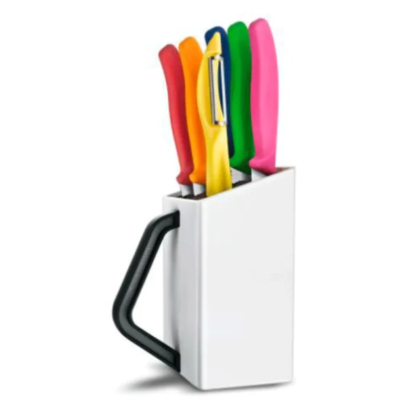 UTILITY BLOCK, 6 PIEZAS Incluye seis tipos de piezas de diferentes colores Con un diseño compacto, moderno y de calidad Viene almacenado en un recipiente con asa para un transporte cómodo. Ideales para distintos usos de cocina. Incluye dos piezas de borde ondulado diseñados con mango de propileno para la tarea de cortar todo tipo de carnes. Poseen una hoja ultra-afilada y serrada que corta sin ningún esfuerzo. Incluye tres cuchillos de punta afilada Tambie viene un pelador con borde serrado que es ideal para todo tipo de superficies y fibras o pieles.